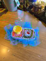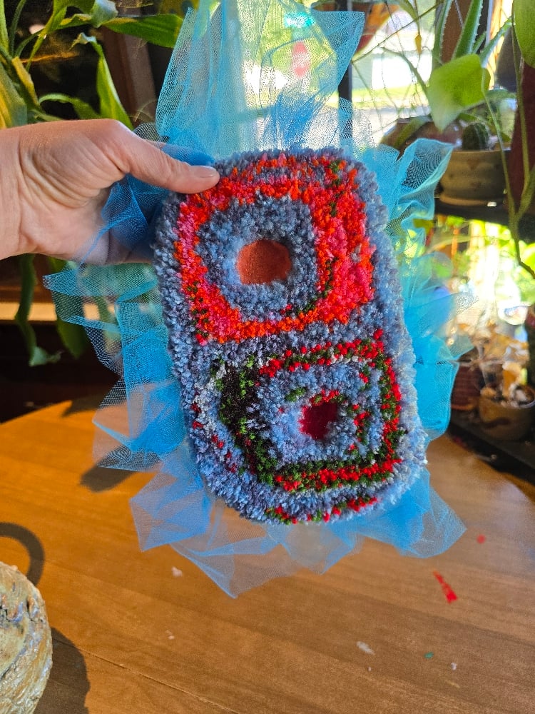 I hadn't made any clay items for several months, each time I would get out a bag of clay I just wanted feeling it. As this was going on, I had gotten an offer to teach the kids at the neighborhood center ceramics. As I was observing the kids making their items, they just had this ease about their projects. I would have thought as they were handing me "cups" that clearly wouldnt hold water, they might have gotten upset about this. But no, they were just happy to be getting messy and to have access to art. This inspired me to just go home and make something stupid and pretty. After a few long nights the yellow ceramic pieces were born and fired. Now, these pieces are beautiful. HOWEVER since I made them with the mind of a CHILD they dont balance the best on their own. THIS is when the rugs were born. I took on the fortitude of those children and i brought the project further instead of pouting over my shortcomings. The rugs were tufted by me. The purpose it serves is to keep your little ceramic in place. and it it ever does fall over it falls on a nice soft surface.